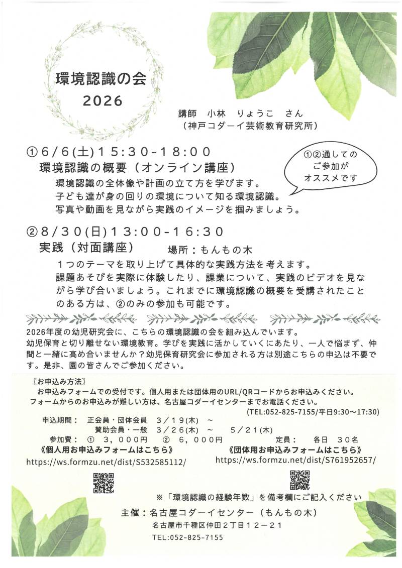 ※2026年度研究会②幼児の発達とあそびの中に、環境認識の会が組み込まれています。研究会に参加されている方は、別途講座の申込みは不要です。